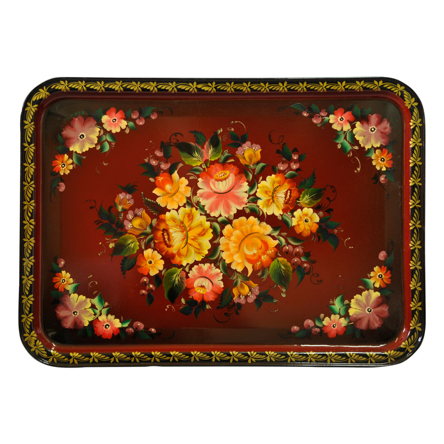Поднос «Букет» прямоугольной формы с закругленными углами. Фон темно-бордовый. Вертикальная композиция. На зеркале подноса цветочная роспись. В центре букет из крупных розанов: розово-желтого и оранжево-желтого цвета. Розаны обрамлены более мелкими цветами, листьями, ягодами. В углах на плоскости подноса маленькие гирлянды с тремя цветами в обрамлении листьев и ягод. Борт черный, украшен золотным растительным орнаментом. В левом нижнем углу авторская подпись: «Кокина», выполнена краской зеленого цвета.