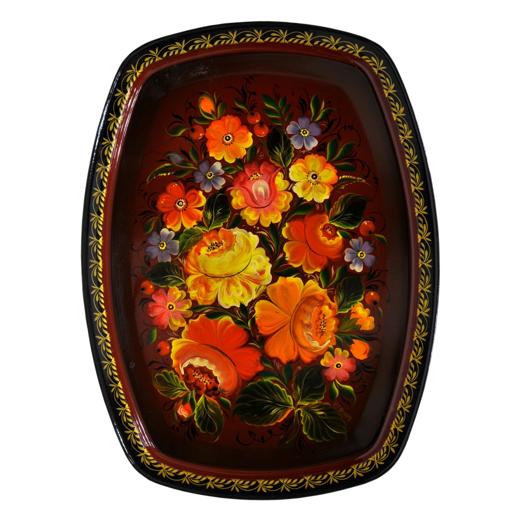 Поднос «Букет» усеченной овальной формы. Фон темно-бордовый. Вертикальная композиция. На зеркале подноса цветочная роспись в виде букета, состоящего из трех крупных розанов: оранжевого, красного и желто-оранжевого цвета в обрамлении более мелких розанов, цветов, листьев и ягод. По черному борту подноса проходит растительный золотный орнамент. Внизу справа над листом авторская подпись «Игонина» выполнена краской зеленого цвета.