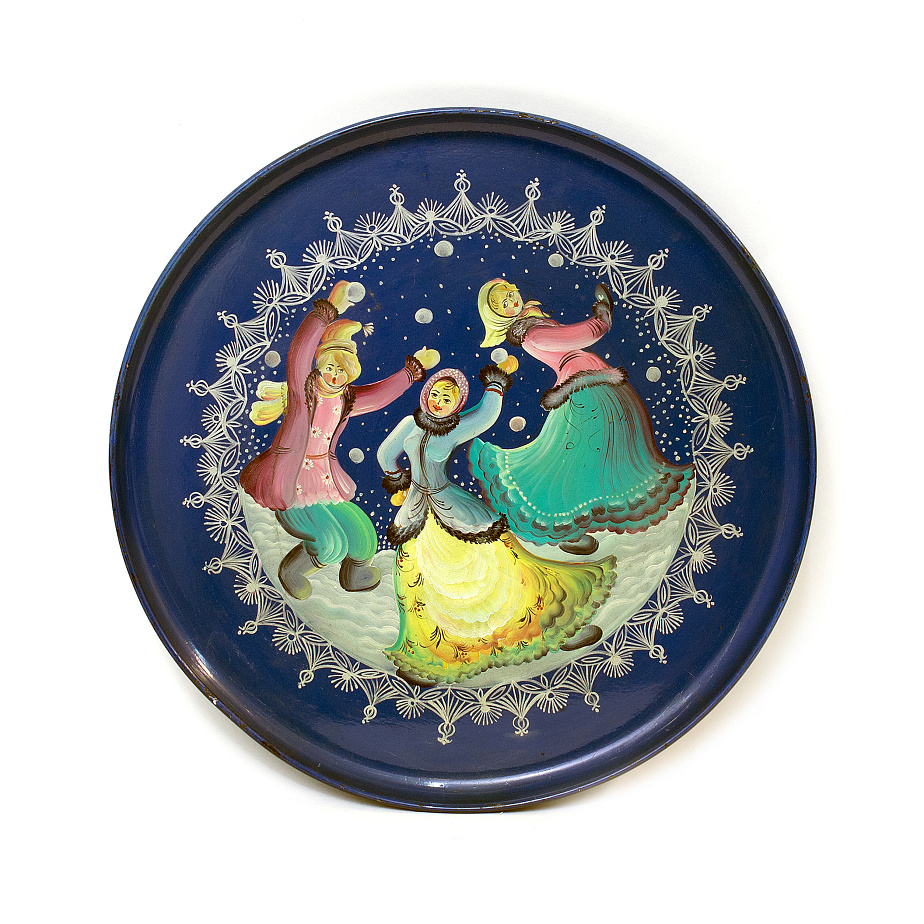Круглой формы. Фон синий. Сюжетная роспись в стиле лубка: фигуры парня и двух девушек, играющих в снежки. По краю росписи серебристый орнамент в виде снежинок.