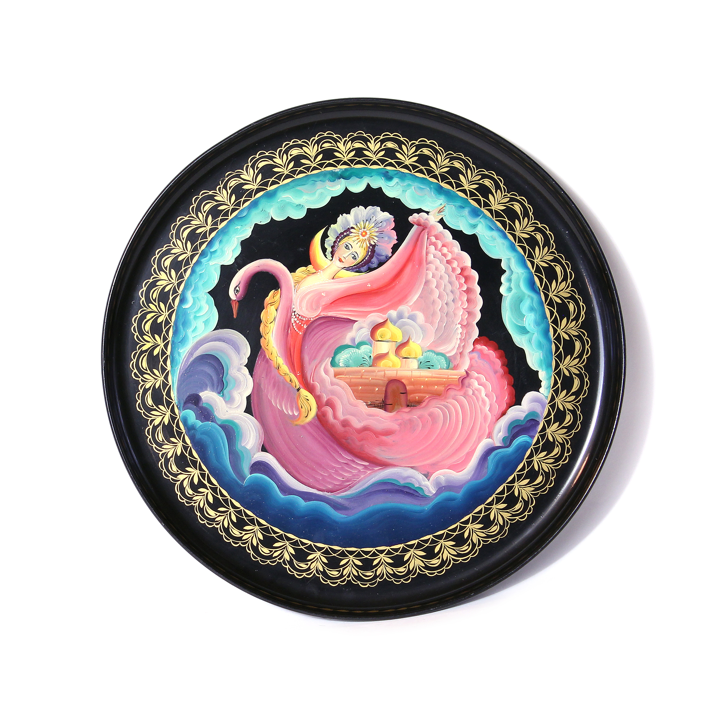 Круглой формы. Фон черный. Сюжетная роспись в стиле лубка по сказке А.С. Пушкина «О царе Салтане». Среди сине-зеленых волн в центре фигура Царевны-Лебедь в сарафане розового цвета. На дальнем плане изображены терема с куполами. По краю плоскости подноса широкий золотный орнамент.