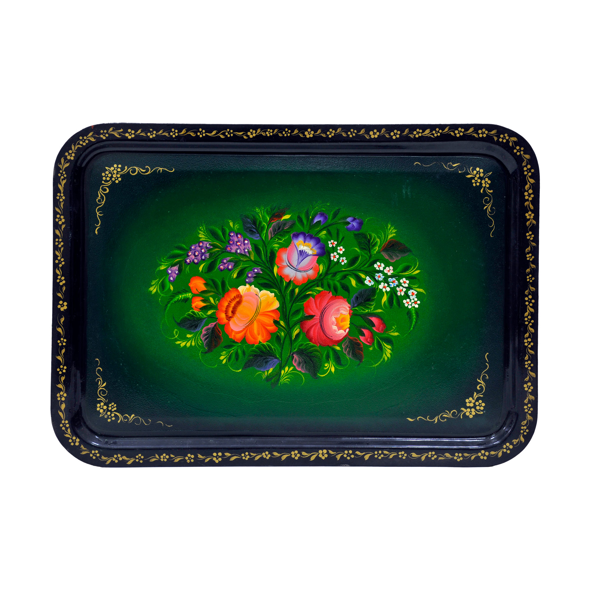 Поднос прямоугольной формы. Фон зеленый с переходом к борту в темно-зеленый. Край зеркала подноса и борт – черный. Горизонтальная композиция. На плоскости подноса цветочная роспись в виде букета из трех крупных цветов: оранжево-желтого, темно-розового, розово-фиолетового цвета в обрамлении мелких белых, сиренево-фиолетовых цветочков и листьев зелени. В углах плоскости подноса и борту проходит золотный растительный орнамент в виде мелких цветочков и листьев. Зеркало подноса не покрыто лаком и имеет шершаво-пузырчатую текстуру.